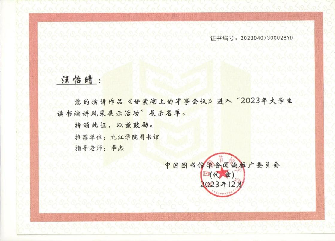 近期,中国图书馆学会公布了2023年大学生读书演讲风采展示活动评审结果。本次活动共收到全国高校推荐的作品770部,经过初审、复审、研议、确认等环节,最终评选出入展作品58部。永利yl23411集团官网学子外语A2015班汪怡晴在此次全国大学生读书演讲风采展示活动中取得佳绩,演讲作品《甘棠湖上的军事会议》(指导教师:李杰)被评为入展作品。
