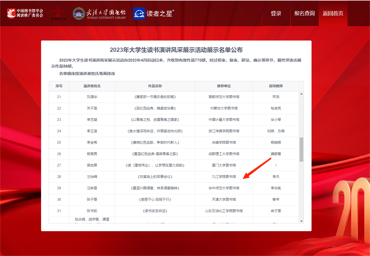 此次大学生读书演讲风采展示活动旨在全面贯彻落实党的二十大精神,充分发挥红色资源教育人、激励人、塑造人的重要作用,引领当代大学生利用红色资源,发扬红色传统,传承红色基因,通过阅读与演讲的形式获取文化知识、展示青春风采,凝聚青年奋斗力量。今后,校图书馆将继续加强与各方的联系合作,携手推进阅读推广与文化育人。