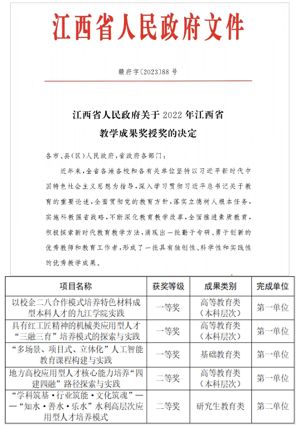 近年来,共获批教育部产学合作协同育人项目立项144项;获批江西省教学研究改革项目113项,其中重点项目22项;2021年,获批江西省教学成果一等奖2项、二等奖2项;2023年,江西省教学成果奖纳入江西省人民政府表彰常设项目,学校在奖项总数降低的情况下获得一等奖3项、二等奖2项,一等奖数量创历史新高;新增省级高水平教学团队14个、省级虚拟教研室3个、国家级普通话测试员1人;获得各级各类教师教学竞赛国家级奖5项、省部级奖76项。
