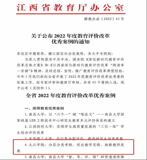 学校按照《深化新时代教育评价改革总体方案》精神和我省“两清单一安排”要求,以深化新时代教育评价改革为引领,提高政治站位,强化责任担当,结合学校实际,改革教师评价,从师德师风、教育教学实绩、教师科研评价、教师育人成效等四个方面,形成了“四位一体”的九江学院教师教育教学实绩评价方案,2021年获批江西省教育评价改革第一批试点单位,《教师教育教学实绩评价》获得首批试点项目。2022学校推送的《分层分类考核,突出教学实绩,助推教师发展》案例成功入选江西省教育评价改革优秀案例,江西教育电视台对永利yl23411集团官网教育评价改革工作进行了专访。
