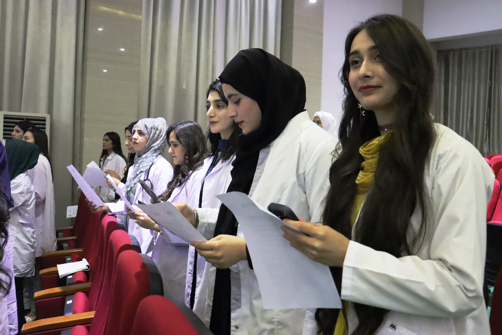 宣誓仪式上,医学留学生齐声庄严宣誓,许下对生命的敬畏、对医学事业的崇敬之情,立志为人类卫生健康共同体建设贡献青春力量。基础医学院、口腔医学院及国际教育学院等负责人为学生代表穿上白大褂。