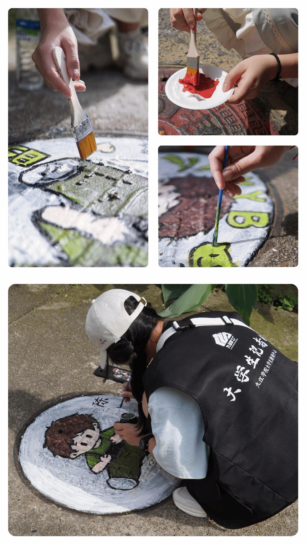 如今在九江学院主校区内,共有60多个画着创意画的井盖。“每次看到都会忍不住停下来拍照。”文学院A2223班的代菲停下去三食堂的脚步,打卡附近的井盖画,开心地说,“加上以前拍的,相册已经满啦!”