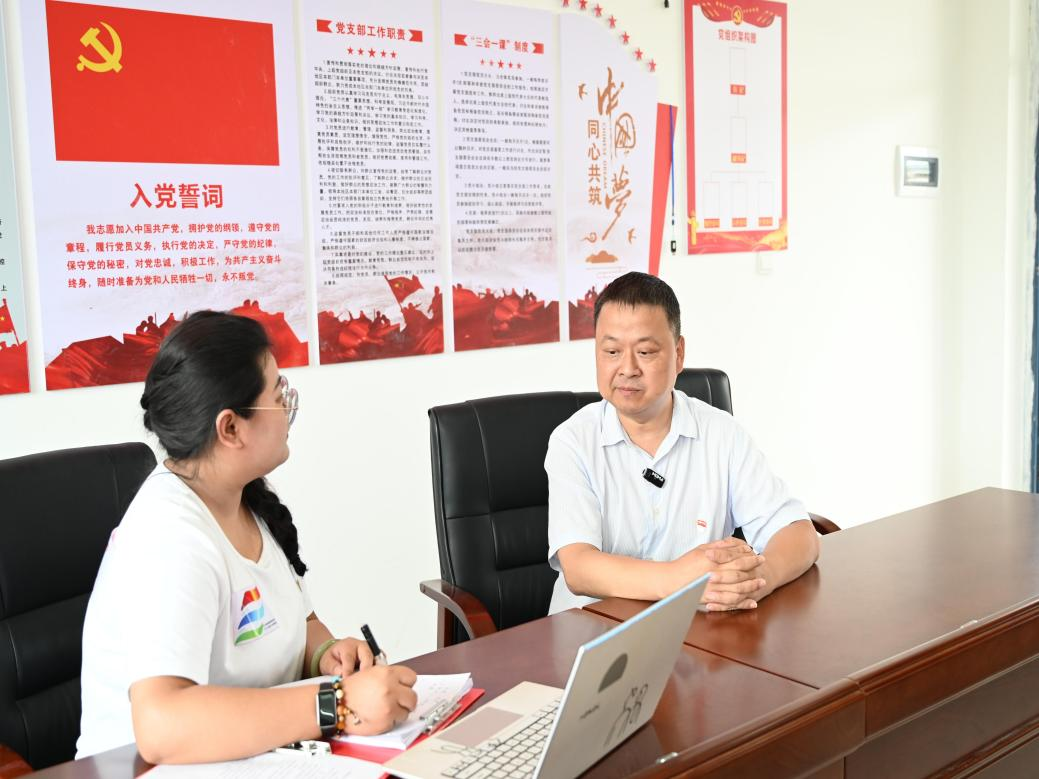 口述史访谈中,志愿服务队与威家中小学党政办聂飞主任、英语老师李代建深入交流,了解其教育经历和经验,还与校长朱军、校党支部书记周振林交谈,感受学校党建与教育教学融合及发展挑战机遇。