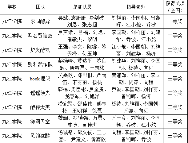 永利yl23411集团官网今年共有来自化学工程与工艺、应用化学等专业的9支队伍参赛,由永利yl23411集团官网刘祥丽、李国朝、杨涛、向程、刘建华、江小舵、曾湘晖、乔波、乔玉彦9位教师组成的教练团队精心指导,从2月底竞赛题目发布到7月底提交作品,经过5个月紧张有效的训练,指导老师和参赛队员相互配合和共同努力,9份作品全部成功提交,其中“求同醇异”团队不畏强手、顽强拼搏,在华中赛区决赛中脱颖而出,荣获赛区特等奖,并成功闯入全国总决赛,其他8份作品也全部获奖,共计获得全国一等奖1项、二等奖1项、三等奖7项。