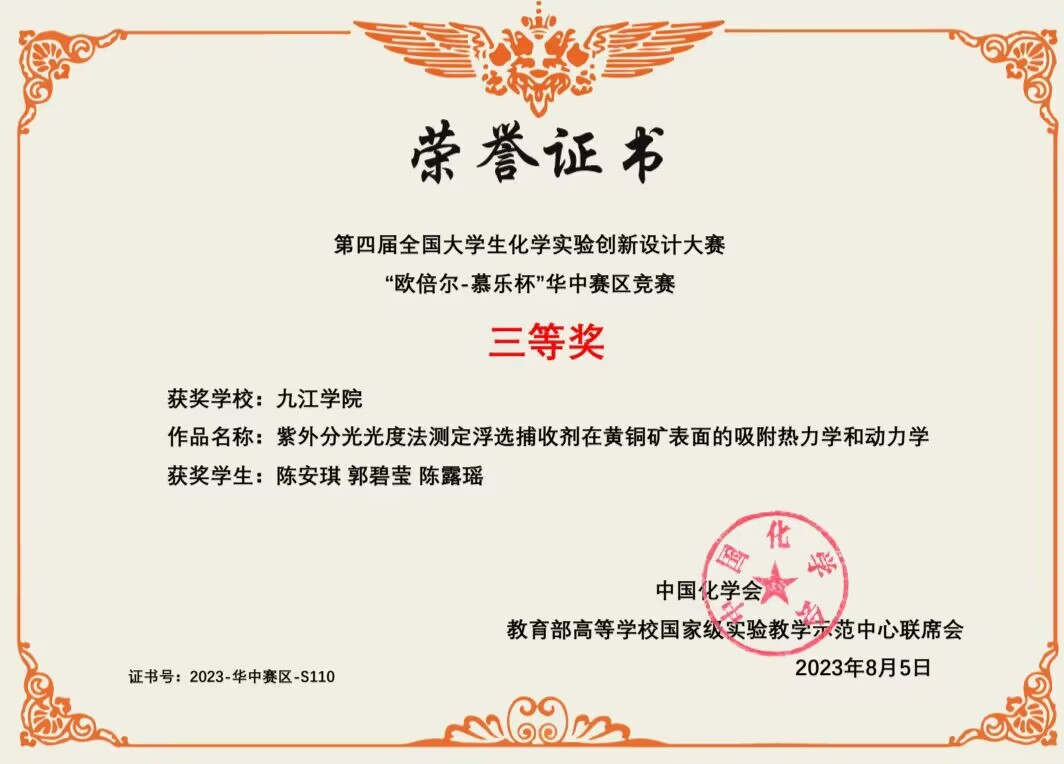 据悉,化学化工学院一直以来积极推行“本科生导师制”,三位同学从入学伊始就对科学研究表现出了的浓厚兴趣和强烈的求知欲,在大二时就加入了曹飞、孙德四老师科研团队,通过刻苦训练,实验操作能力得到不断提升,在掌握对矿物加工及材料科学领域了解的同时,也深刻体会到化学化工专业知识在工业实际生产中的理论价值。此外,陈安琪同学在大三时还与郭碧莹、陈露瑶同学组队参加了第四届全国大学生化学实验创新设计大赛,并荣获华中赛区三等奖。