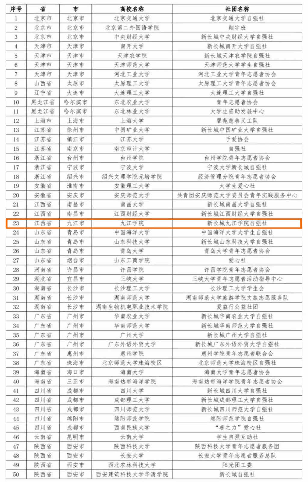新长城九江学院自强社自2006年成立以来,在学生工作处(学生资助管理中心)的指导下,一直致力于传递社会关爱,培养自强不息的人才。社团以“自强、自立、互信、互助”为宗旨,激发了学生的自立自强意识,助力他们健康成长,在师生心中播下了公益的种子。