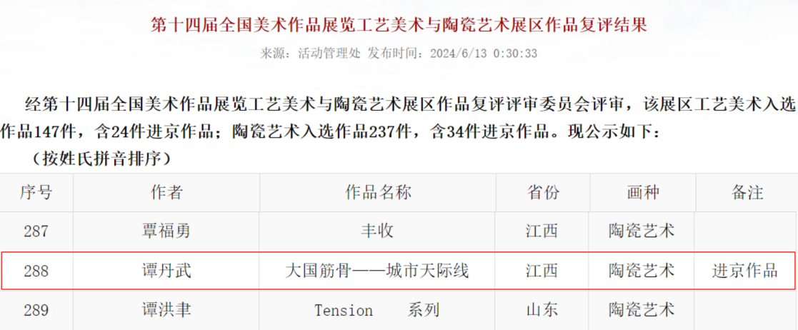 日前,第十四届全国美术作品展览进京作品展在中国美术馆和中国国家博物馆进行。在各展区的作品复评结果中,永利yl23411集团官网艺术学院谭丹武老师的陶艺作品《大国筋骨-城市天际线》成功入选,并被选为进京作品,这也是九江市在第十四届全国美展上唯一入选的进京作品。同时,艺术学院教师张甘霖的艺术作品《竹影印记》也入选本届全国美展壁画展区作品展。