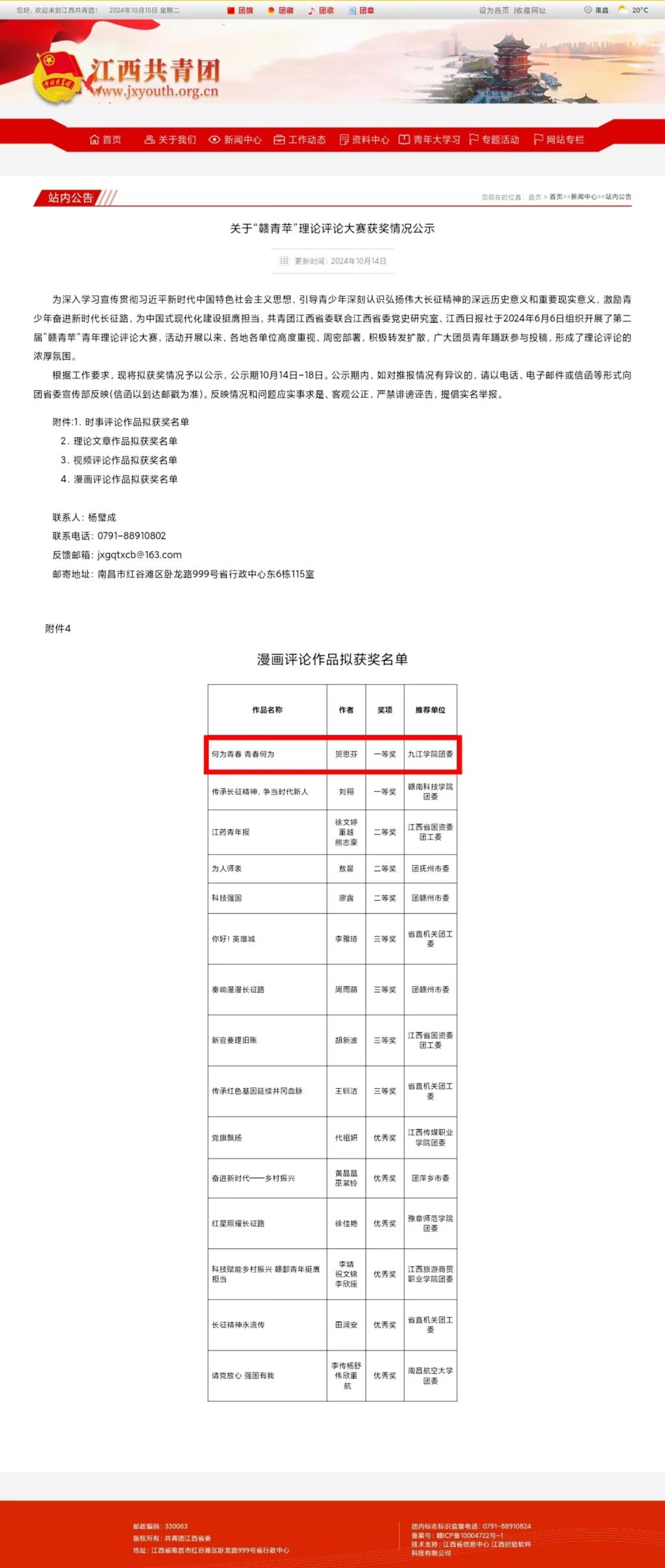 为深入学习宣传贯彻习近平新时代中国特色社会主义思想,激励青少年奋进新时代长征路,为中国式现代化建设挺膺担当,近日,共青团江西省委联合江西省委党史研究室、江西日报社组织开展了第二届“赣青苹”青年理论评论大赛。在此项赛事中,永利yl23411集团官网外国语学院贺思芬同学的作品《何为青春青春何为》荣获本届“赣青苹”青年理论评论大赛漫画评论类作品一等奖。
