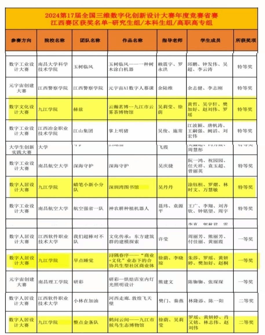 在全国三维数字化创新设计大赛中,永利yl23411集团官网建工学子再次发力,一举夺得省级特等奖2项、一等奖1项、二等奖1项,彰显了他们在三维数字化创新设计方面的卓越才能和深厚实力。九江学院多个团队在比赛中奋力拼搏,最终“深圳湾图书馆”创作团队与“赫兹——云瀚茗博”创作团队分别在吴丹丹与吴莉莹、徐荫三位老师的指导下荣获省级特等奖;“浔隅春序”创作团队在徐荫、李晓琼老师的指导下荣获省级一等奖;“鹤问云间”创作团队在徐荫、吴莉莹老师的指导下,荣获省级二等奖。