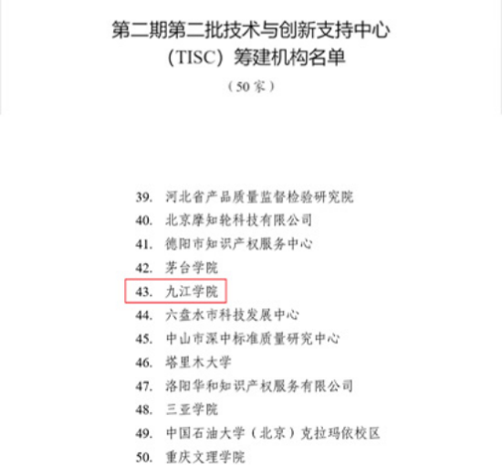 近日,根据国家知识产权局办公室印发的《国家知识产权局办公室关于确定第二期第二批技术与创新支持中心(TISC)筹建机构并启动筹建工作的通知》,九江学院入选世界知识产权组织(WIPO)在华技术与创新支持中心(Technology and Innovation Support Center,TISC)筹建机构。一年筹建期满后,经评估符合条件可正式运行。