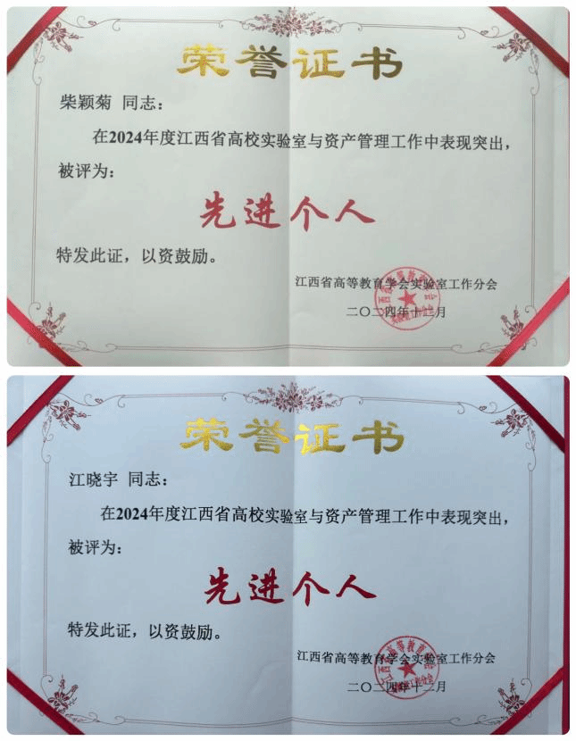 此外,实验室管理科柴颖菊老师与资源环境学院实验室副主任江晓宇老师,荣获了“先进个人”称号。