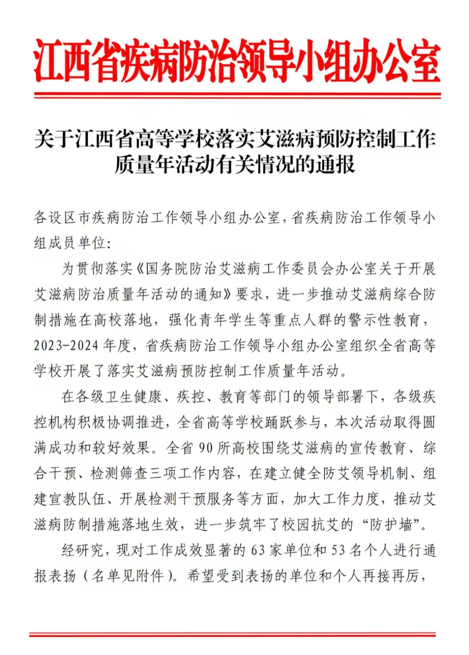 近日,江西省高校艾滋病防治质量年活动评选结果揭晓,永利yl23411集团官网荣获“红丝带先锋学校”二等奖(排名第六),王秋慧老师获评优秀指导教师。