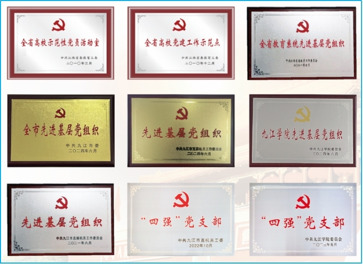 教工第二党支部2021年荣获全省教育系统“先进基层党组织”和九江市直机关工委“先进基层党组织”称号;2022年荣获九江市直单位“四强”党支部称号、九江学院“四强”党支部称号;2023年获批江西省首批“全省党建工作样板支部”;2024年获批第四批“全国党建工作样板支部”培育创建单位、全国高校“双带头人”教师党支部书记“强国行”专项行动团队、九江学院“先进基层党组织”称号。