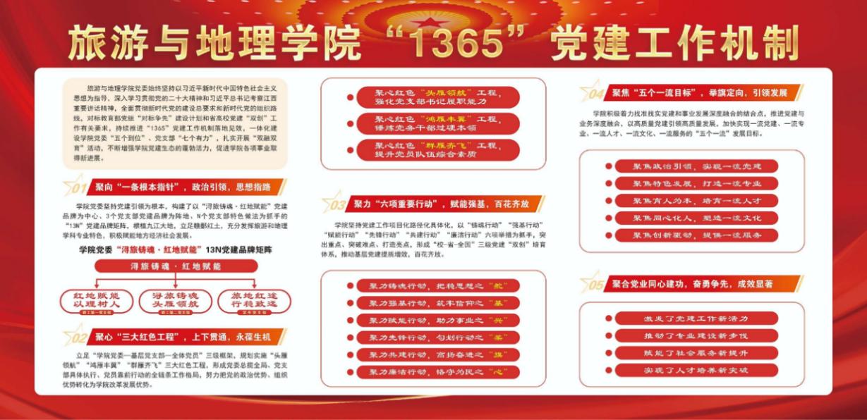 学院坚持以习近平新时代中国特色社会主义思想为指导,深入贯彻落实新时代党的建设总要求,对标高校党建“双创”工作有关要求,坚持以高质量党建引领学院高质量发展。提炼出“浔旅铸魂·红地赋能”学院党建品牌,构建“1365”党建工作机制。推进党建与业务深度融合,加快实现一流党建、一流专业、一流人才、一流文化、一流服务的发展目标。