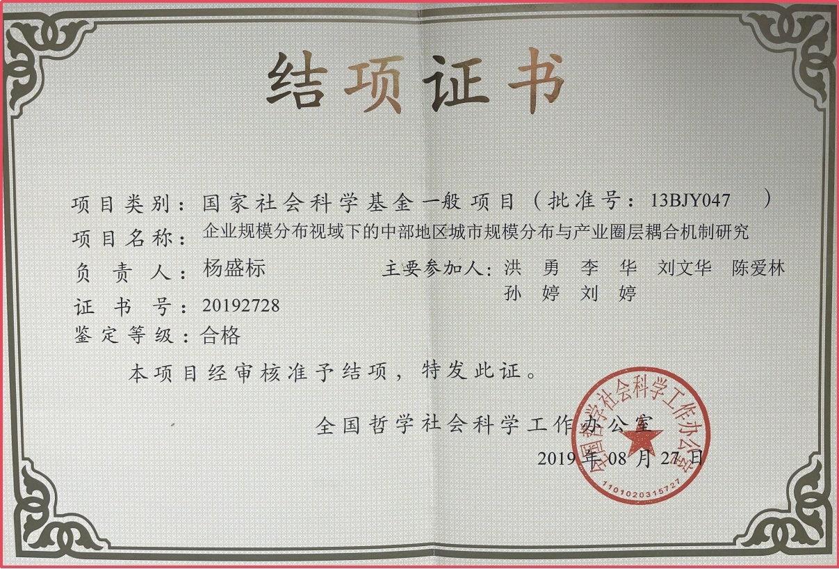 杨盛标博士国家社科基金结题证书