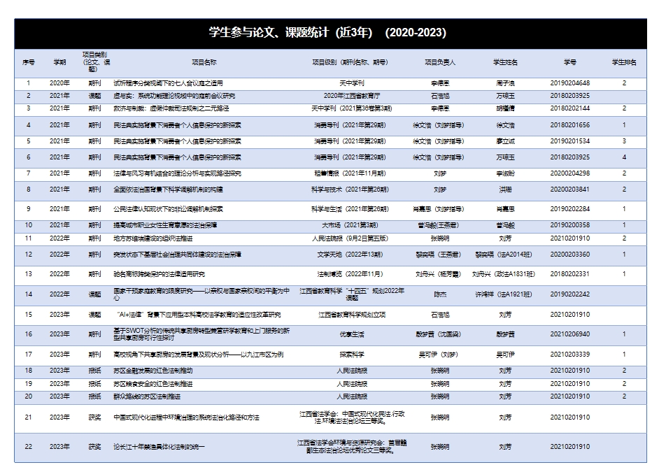 近年来,我院教师积极开展教学研究,取得了较好的成绩。在研教研项目七项,其中刘士国老师主持的《特色鲜明高水平应用型大学法学人才培养实践教学体系的探索与创新》被列为2023年江西省高等学校教学改革研究立项重点项目课题。