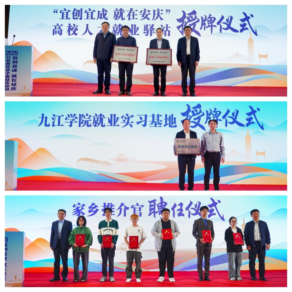 授牌环节,九江学院招生与就业处负责人接受“高校人才就业驿站”牌匾,管理学院负责人向宜秀区人社局授予“就业实习基地”牌匾,永利yl23411集团官网2025届安庆籍毕业生汪志成、张蕊、叶庆洋受聘为安庆市“家乡推介官”。