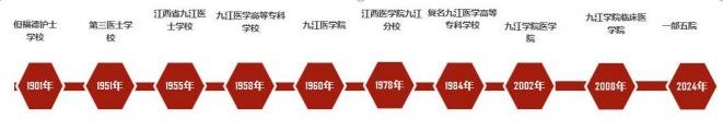九江学院医学教育有着坚实的成长足迹。在 1901年创办的但福德护士学校基础上,1951年江西省人民政府创办第三医士学校,开设医士专业。1955年定名为江西省九江医士学校,1958年升格为九江医学高等专科学校,开始创办专科临床医学专业,1960年学校更名为九江医学院,1978年成为江西医学院九江分 院,1984年复名九江医学高等专科学校,2000年学校开办临床医学专业本科教育。2002年九江医学专科学校参与组建九江学 院,成为九江学院医学院。2008年更名九江学院临床医学院,2024年6月,与医学部、基础医学院、护理学院、药学与生命 科学学院、口腔医学院共同形成九江学院“一部五院”格局。学 校医学生由原来的分段式管理转变为按专业一贯式管理。