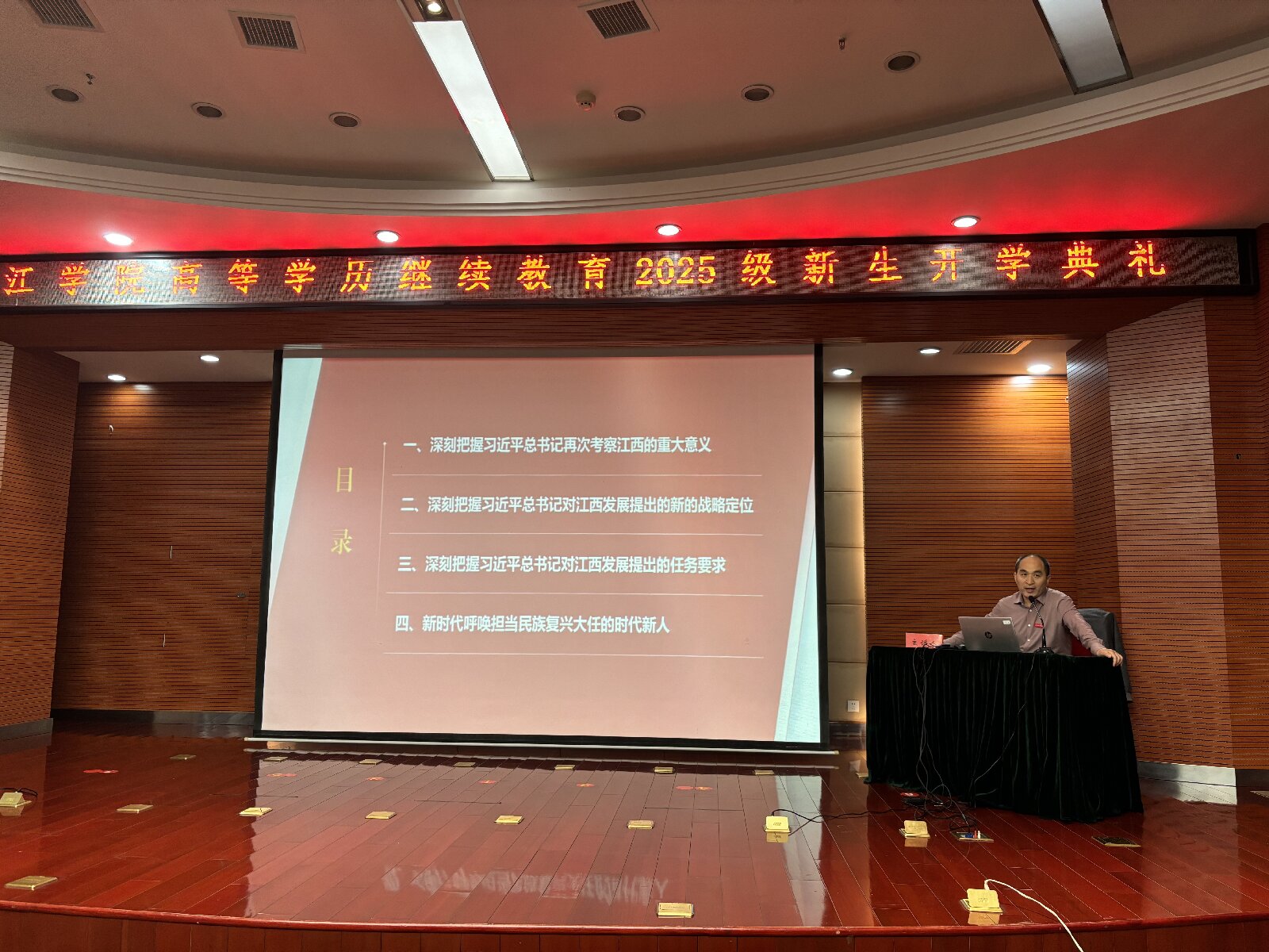 4月19日上午,九江学院高等学历继续教育2025级新生开学典礼暨开学第一课在学校丹枫园举行。本次开学典礼采取网络视频会议方式进行,在逸夫图书馆报告厅设主会场,各校外教学点设分会场。校党委委员、副校长查振华出席典礼并讲话。