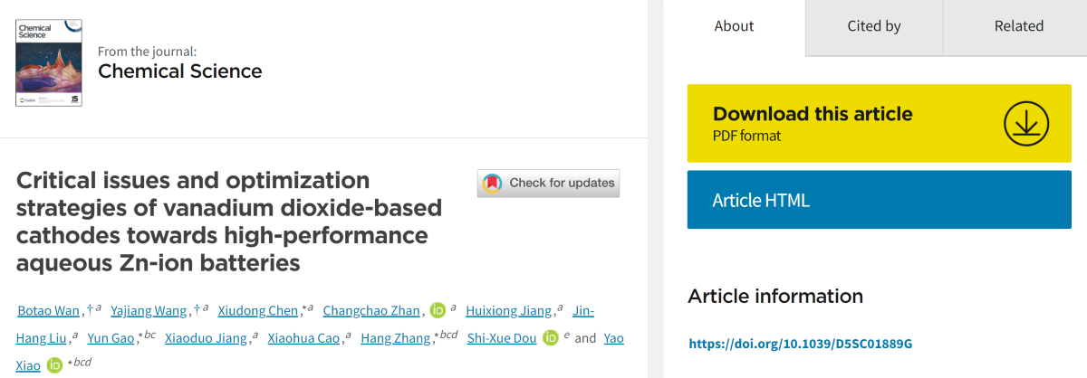 近日,在化学化工学院陈修栋教授团队的精心指导下,永利yl23411集团官网材料化学专业A2341班万博涛同学以第一作者身份,在《Chemical Science》(化学科学)上发表题为“Critical Issues and Optimization Strategies of Vanadium Dioxide-Based Cathodes Towards High-Performance Aqueous Zn-Ion Batteries”的综述性学术论文。