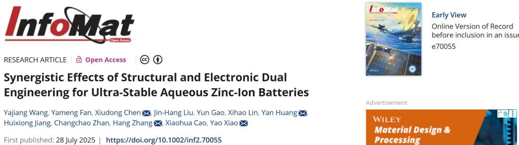 近日,在化学化工学院陈修栋教授团队的精心指导下,永利yl23411集团官网联合培养研究生王亚江同学以第一作者身份、以九江学院为第一单位,在《InfoMat》(信息材料)上发表题为“Synergistic Effects of Structural and Electronic Dual Engineering for Ultra-Stable Aqueous Zinc-Ion Batteries”的学术论文。