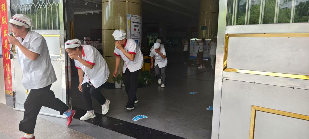 随后进行的应急疏散演练,模拟了食堂后厨发生火情的场景。随着警报声响起,全体员工在安全员的引导下,迅速反应,弯腰低姿、用湿毛巾捂住口鼻,严格按照预定疏散路线,紧张有序地撤离至指定安全区域。整个过程组织严密、行动迅速,达到了演练的预期效果。