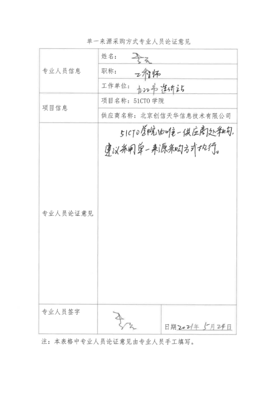 采用单一来源采购方式的原因及说明:北京创信天华信息技术有限公司是“51CTO学院”项目唯一授权供应商,符合政府采购单一来源情形,建议采用单一来源采购方式,由北京创信天华信息技术有限公司具体实施。