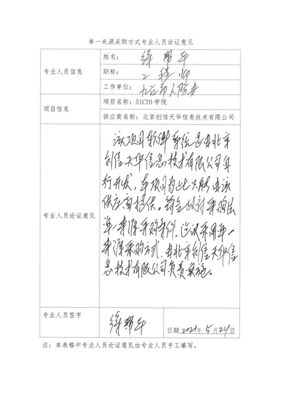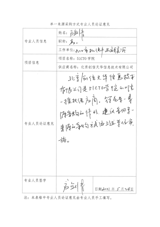 北京创信天华信息技术有限公司是“51CTO学院”项目唯一授权供应商,符合政府采购单一来源情形,建议采用单一来源采购方式,由北京创信天华信息技术有限公司具体实施。